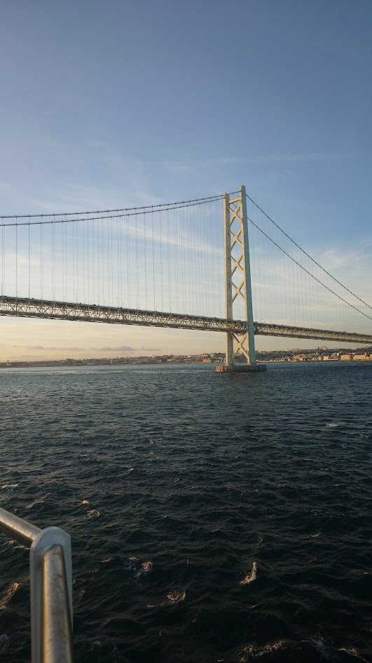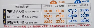 公式情報では、大阪南港発の第1便は18:10に最初の大きな橋「明石海峡大橋」の下を通過します。