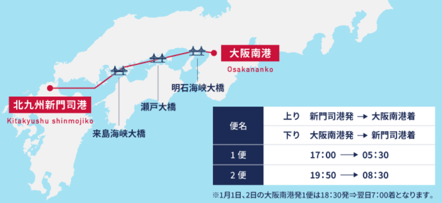 名門大洋フェリーは、大阪の南港と福岡の門司港から1日2便ずつ出ています。