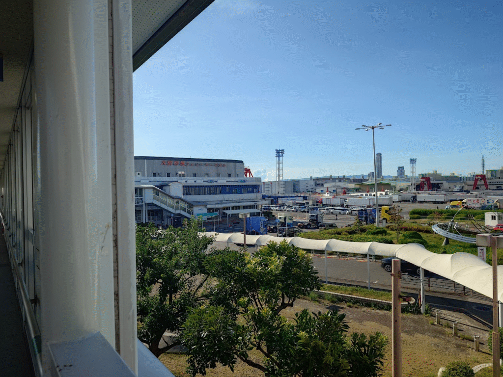 右側にはターミナルが見えてきており、左側には貨物を乗せたトラックがたくさん待機していました。