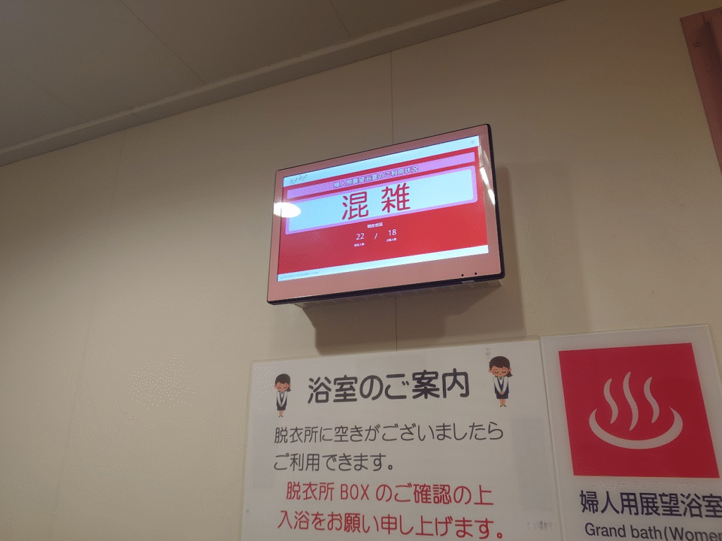 モニターでお風呂に行く前に混雑状況がわかるようになっています。上限の18人を上回る22人が入っていたことがわかります。
